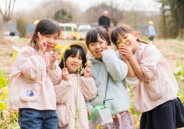 春はやわらか新緑に菜の花が映え、夏は虫たちを見つけます。秋には山栗が実り、冬には落ち葉遊びをして、四季折々に直接体験の中で学び、楽しく遊べる環境です。